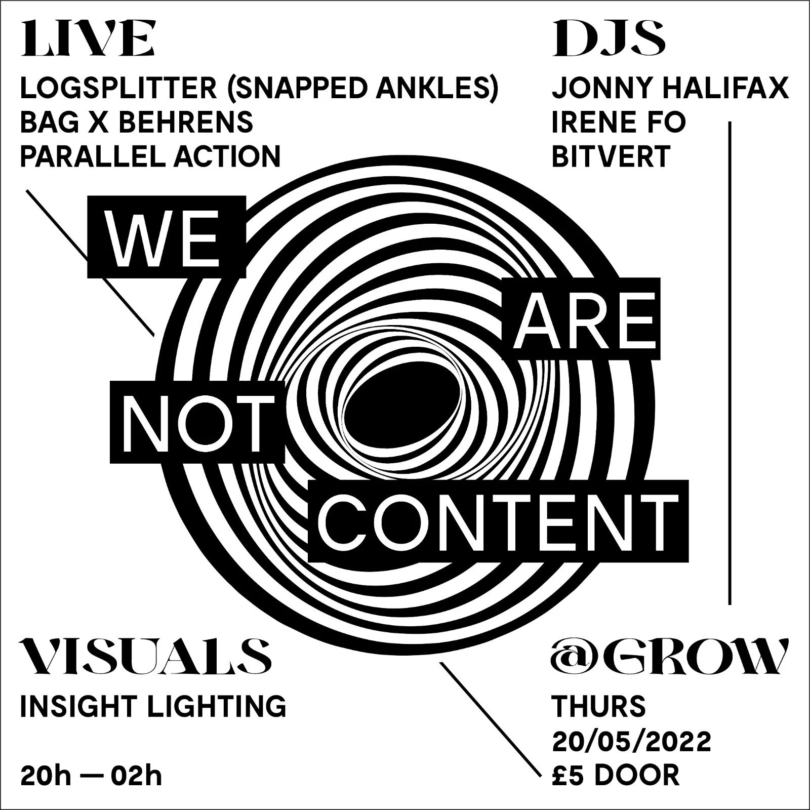 We are not content returns to Grow this time with a special live set from Logsplitter (Snapped Ankles) + more live bands, DJs and visuals.
